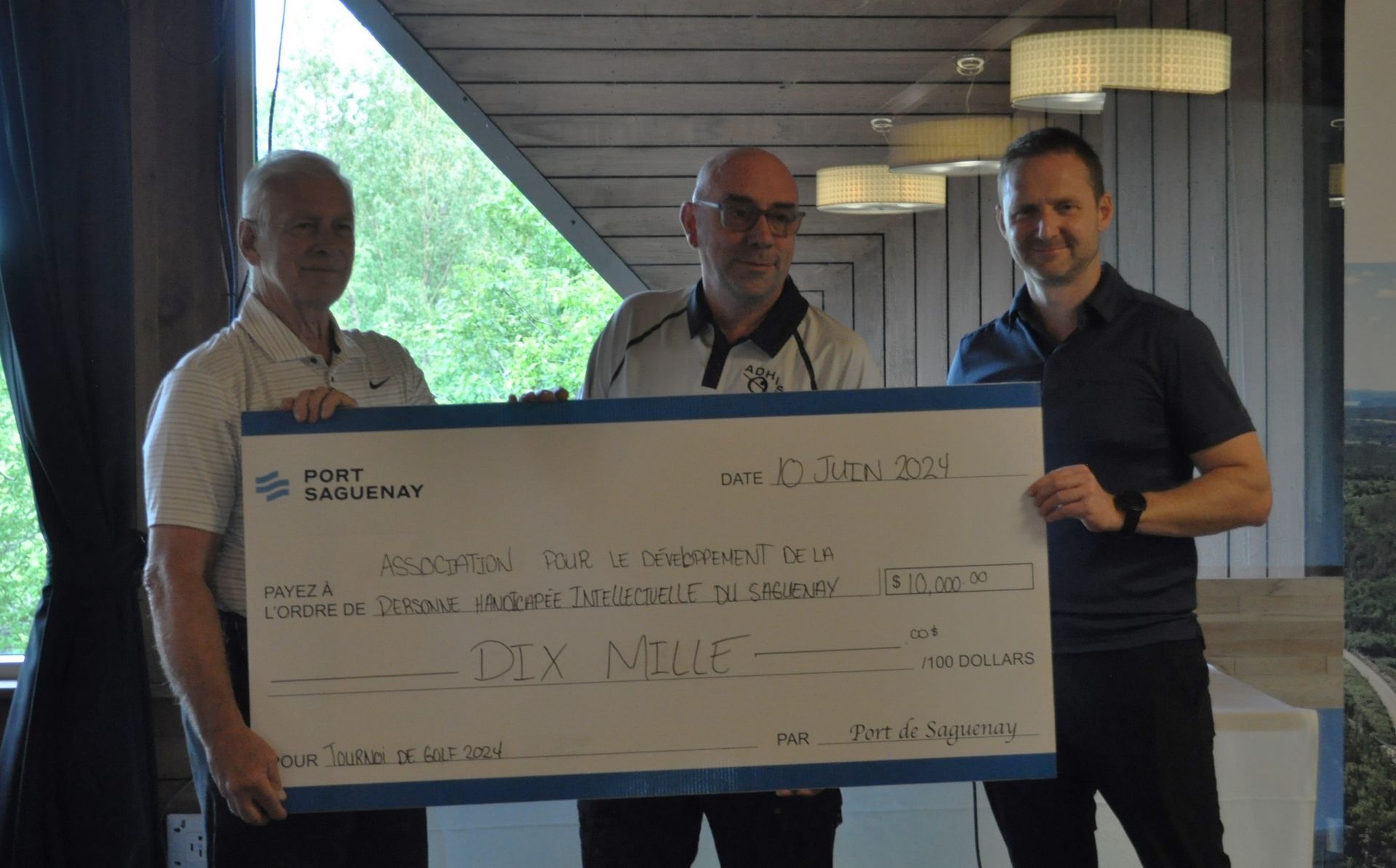 Nous souhaitons remercier chaleureusement Port Saguenay pour le don de 10,000 $remis à notre association dans le cadre de leur Tournoi de golf du 10 juin 2024.